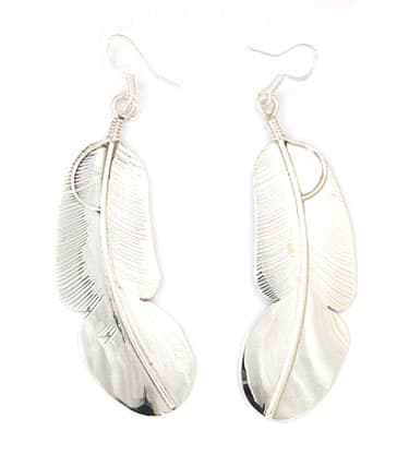 Large sterling silver curved feather earrings. They measure approximately 2 3/4″ long including silver plated french wire by 3/4″ wide at its widest point. Handcrafted by Navajo artisan Chester Charley.