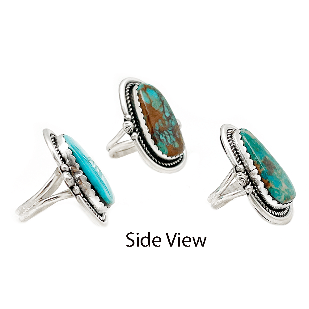 Sterling silver medium free form stabilized Kingman turquoise stone ladies ring with twist and plain wire border with side plain and stamp drops on a double wire split shank. Top measures approximately 1 3/8″ to 1 1/2″ long by 1″ to 1 1/4″ wide. They are Navajo hand made by Junior Begay. Available in size 7, 8 or 9. Choose size when ordering. You may not get the shape or color that is pictured as they are all different. Some have more matrix than others. Currently in teal blue shades.