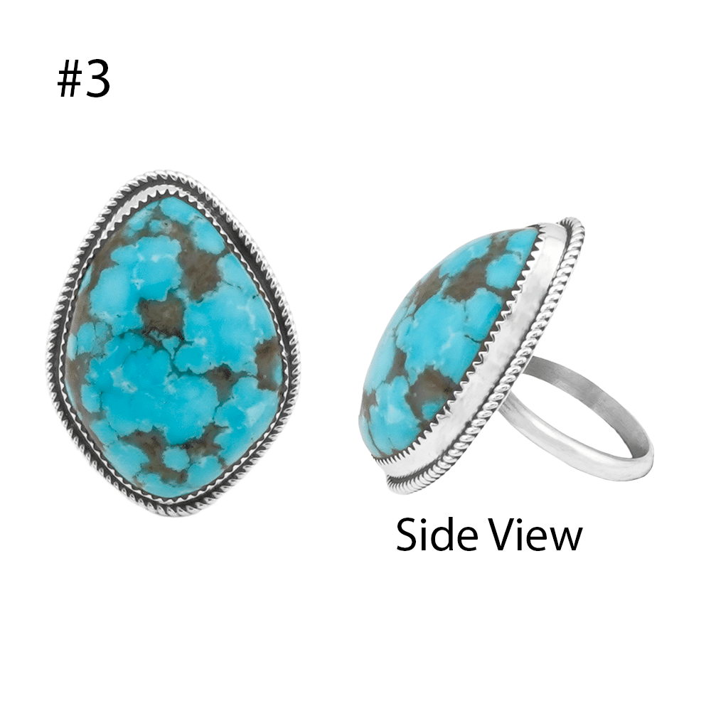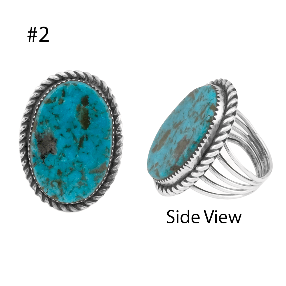 Sterling silver ladies ring with a skinny oval large Kingman turquoise stone and twist wire border on a single wire shank. #1 top measures 1 5/8″ long by almost 3/4″ wide and it is a size 9 1/2. #2 top measures just under 1 1/2″ long by 1 1/8′ wide and it is a size 10 with a 5 round wire shank. #3 top measures just over 1 1/2″ long by 1 1/8″ wide and it is a size 9 1/2. Choose ring by number when ordering. They are all Navajo hand made by Ray Nez and all are Kingman turquoise.