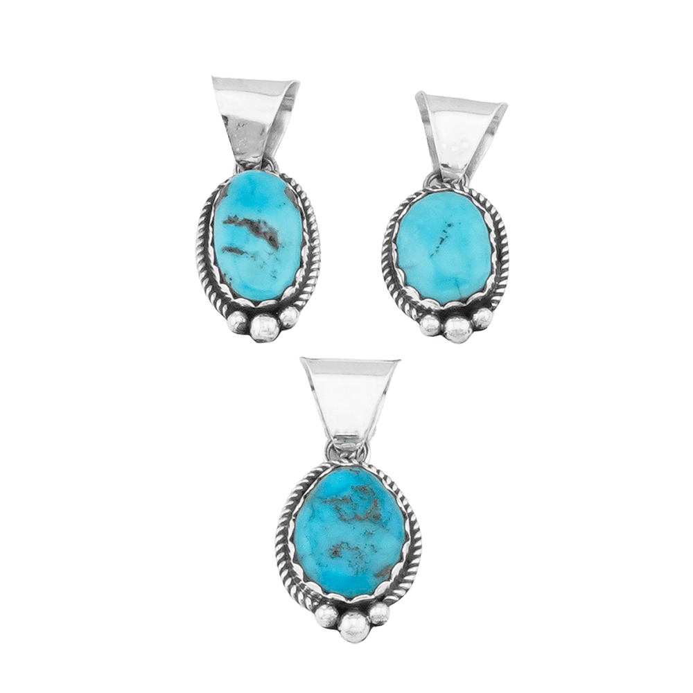 Sterling silver pendant with a free form Kingman turquoise stone, twist wire and three silver drops for the border. It measures approximately 1 1/8″ to 1 1/4″ long including bail (1/4″ opening) by 1/2″ wide. It is Navajo hand made by Alice Johnson. Shade and shape of turquoise will vary and may have little to some matrix.