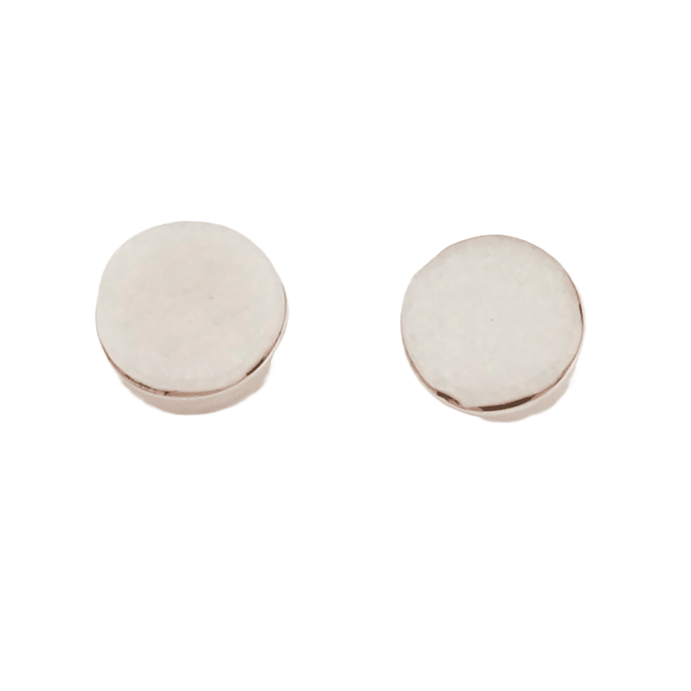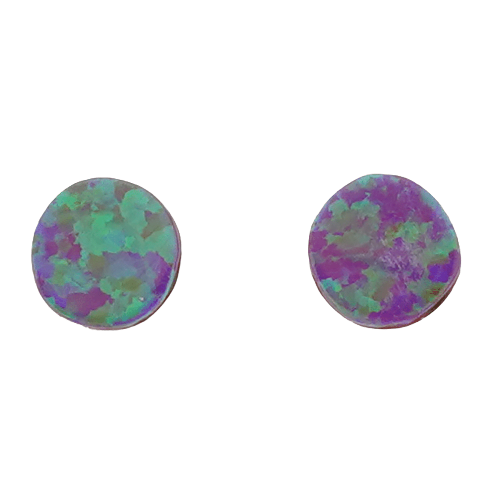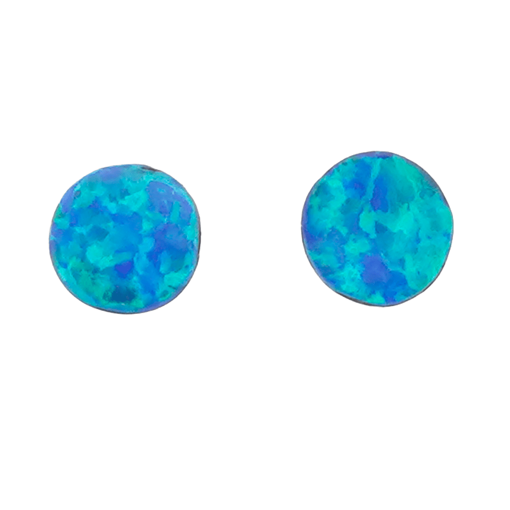 This sterling silver Zuni post earring inlaid with light blue synthetic opal in round shape set in plain bezel. It measures just under 1/4″ in diameter. It is Zuni hand made by Angie Rosetta. Also available in yellow, dark blue, red, purple or white synthetic opal. Choose color when ordering.