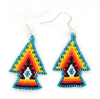 Navajo crafted beaded arrowhead earrings. Measures approximately 2” long including silver plated french wire by 1” wide at its widest point. Crafted by Navajo artisan Brenda Henderson. Colors and patterns will vary. You may not get color that is pictured.
