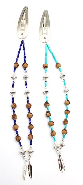 This beaded barrette has two strands of turquoise or lapis colored beads, cedar berry beads (aka: ghost beads), and silver plated beads and feathers. They measure approximately 8″ long with clip barrette and feathers. Crafted by Navajo artisan Sandra Francisco. Choose color(s) when ordering.