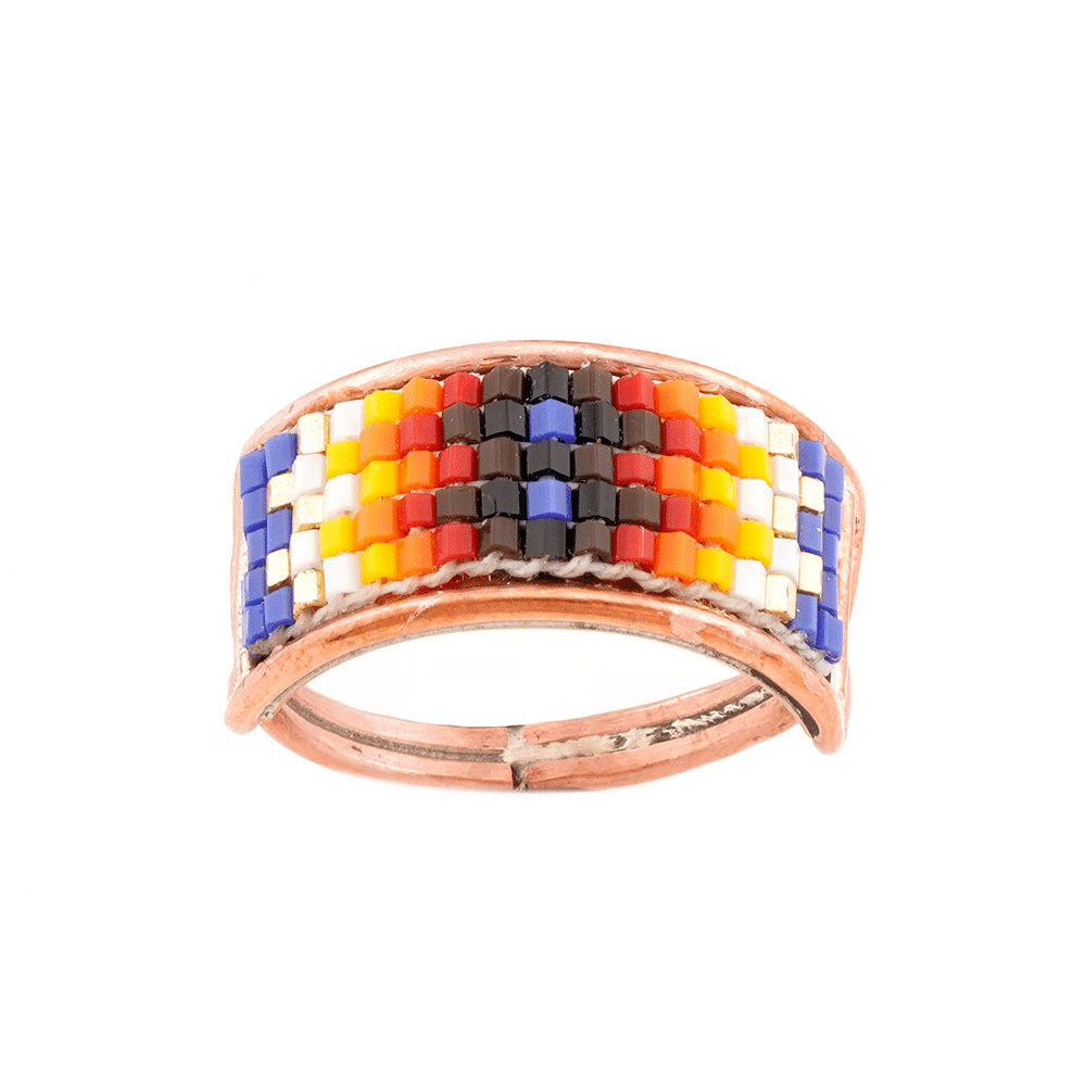 This ladies ring is crafted out of copper with 5 rows of multi colored hex beads. Top of ring measures approximately 7/8″ long across with curve by 7/16″ wide. It is Navajo hand crafted by Geraldrita Whitethorne. Colors and patterns will vary. Available in size 7, 8, 8 1/2, 9, 9 1/2, 10 or 11. Colors and patterns will vary and you may not get what is pictured. Call for more info on main colors available if needed.