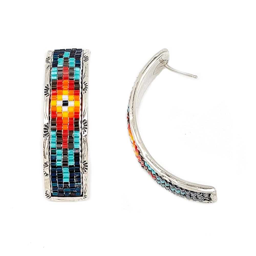 Sterling hoop earring with 5 rows of hex beads and stamped border. It measures just under 1/2″ wide with a 1 1/2″ hoop curve. It is Navajo hand made and crafted by Geraldrita Whitethorne. Only Shiney pink available and Stamped border designs will vary.