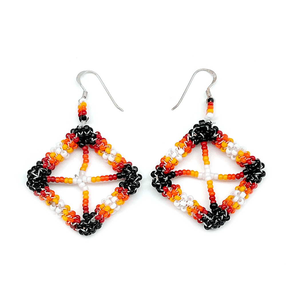 These seed beaded earrings come in two different shapes round or square with a design in the center. The round measures approximately 2″ long with sterling silver french wire by 1 1/8″ wide. The square measures approximately 2 1/4″ long including sterling silver french wire by 1 1/2″ wide. They are Navajo hand crafted by Chad Wallace. Choose shape when ordering. Now only one of each available.