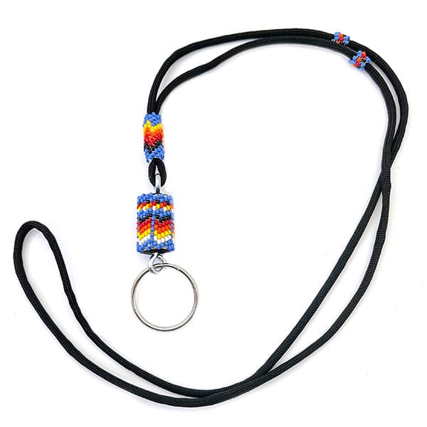 This lanyard is made with a nylon cord and has sections of seed bead wirh a 1″ beaded section dangling with the key ring attached.  It measures 32″ – 36″ long plus the two sections of beadwork and key ring measure 3 3/4″ long by just over 5/8″ wide at widest beaded area.  It is Navajo hand crafted by Jane Whitegoat.  Main colors will vary but currently available in gray, turquoise blue, turquoise teal, shiny hot pink, royal blue, shiny light purple, shiny teal green, black/white, or shiny lime green all with fire colors as well and patterns that vary.  Choose main color or let us choose for you.