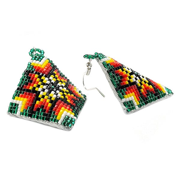 These large, fold, earrings are made with assorted hex beads on white leather, They measure 2 3/8″ long with silver plated french wires by 1 1/8″ wide but folded. It is Navajo hand crafted by Cassandra Martin. Currently main colors available are teal blue or gray with turquoise blue in the center. Patterns are all the same. Choose color when ordering or let us choose for you. **None available like colored picture.
