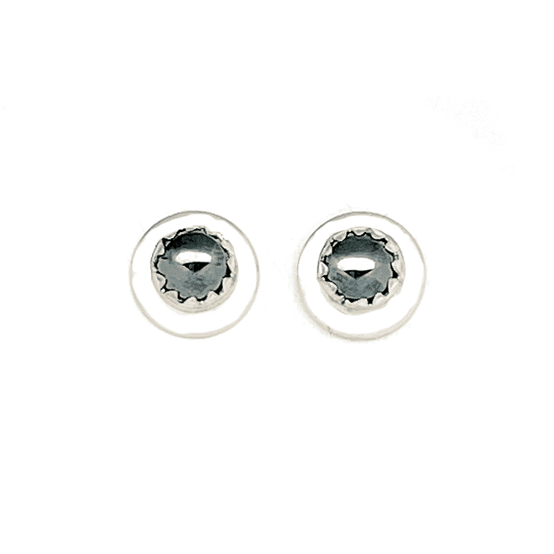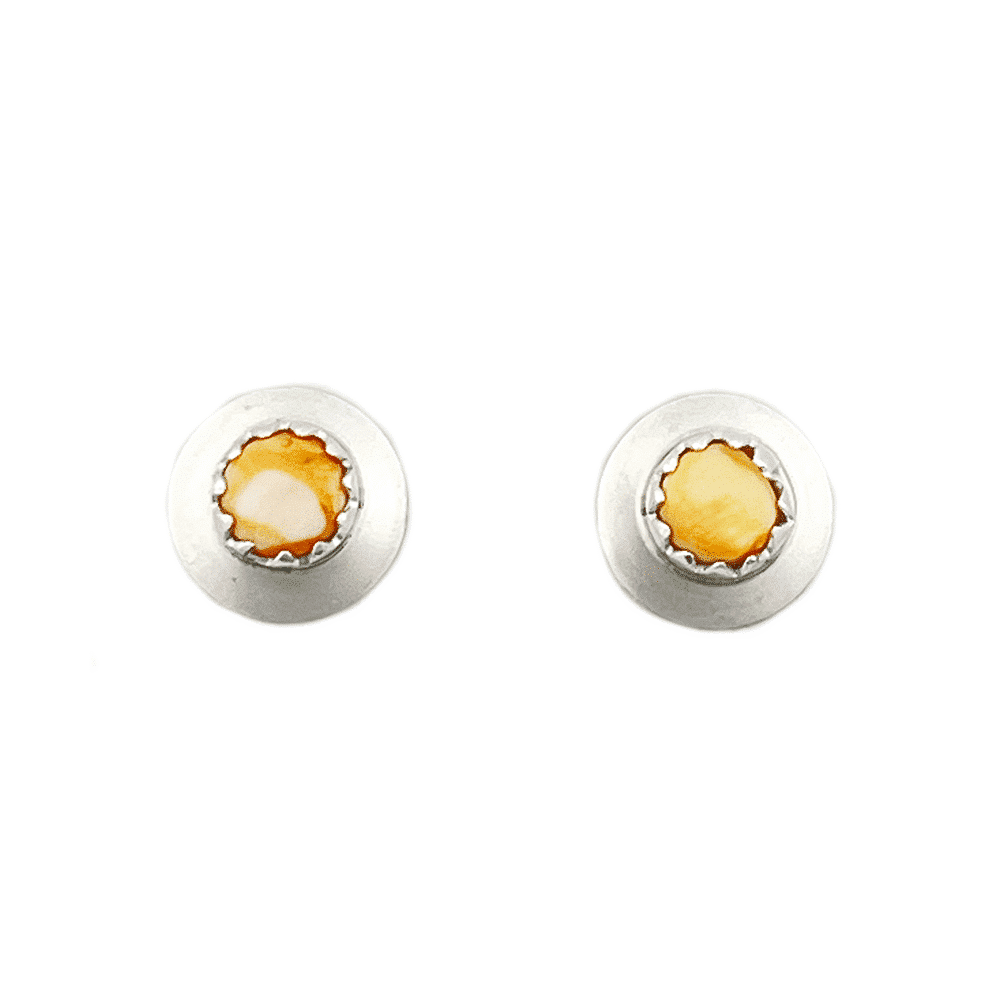 Sterling silver disc earring with one 4mm lapis and sterling silver post with silver plated ear backs. They measure approximately 5/16″ in diameter. Navajo crafted by Alfred McCray and/or Juanita Manygoats. ***Now available in orange spiny oyster, hematine, black onyx, red spiny oyster or white, orange, dark blue, light blue, sea breeze blue, cotton candy pink, light green, cranberry synthetic opal. Choose color when ordering.