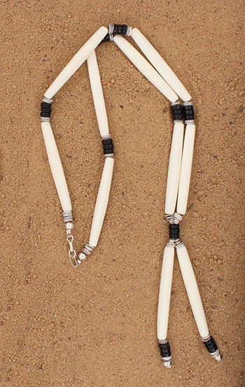 Single strand neckware made with bone tubes and jet and shell disc’s. It measures approximately 20” long and center piece measures 3 1/2″ long. Handcrafted by Naomi Garcia.