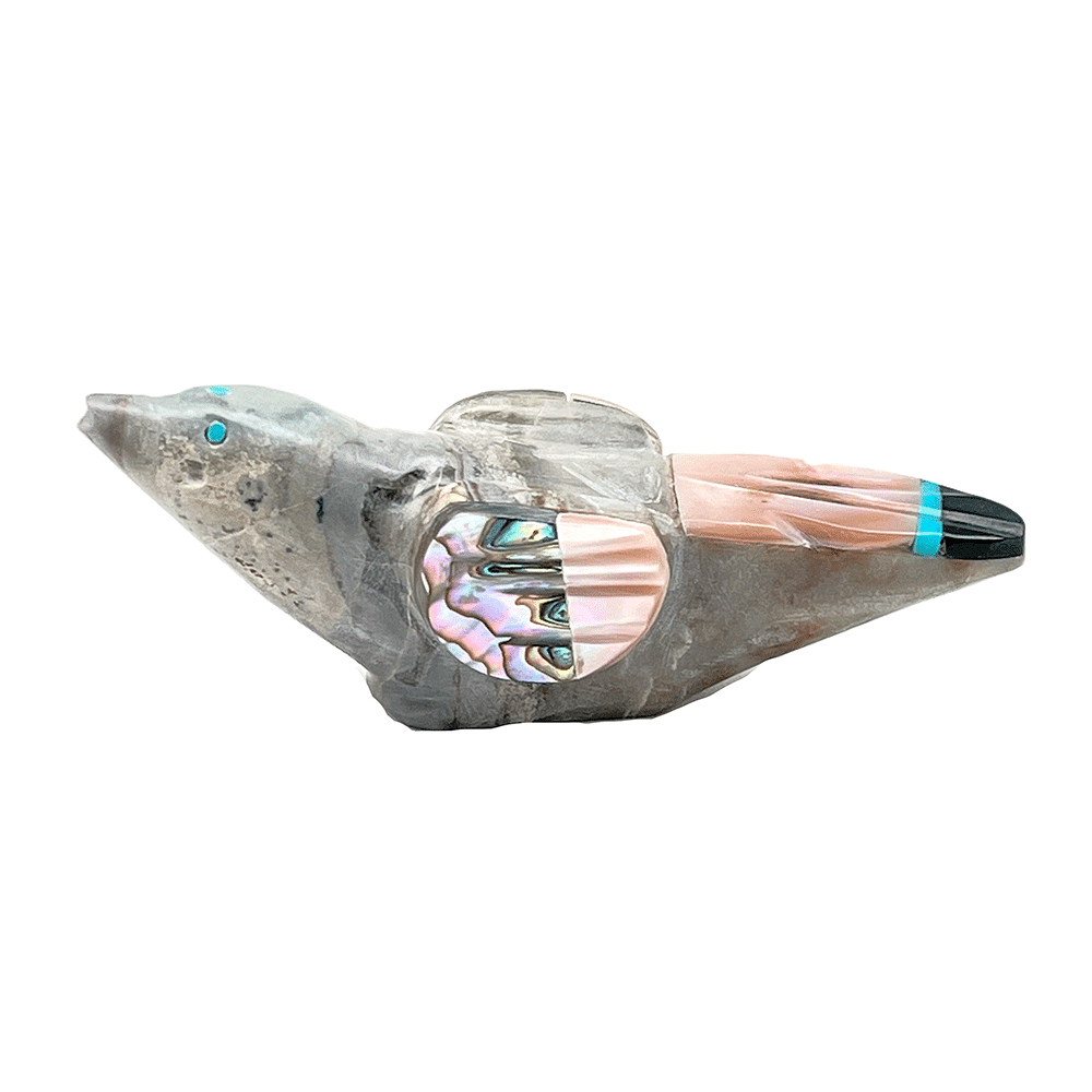 This traditional type bird is carved out of picasso marble with inlaid wings and tail tip. It measures approximately 2 3/4″ long, 1 1/8″ tall by 3/4′ thick. It is Zuni hand carved by Delvin Leekya. Only this one available.