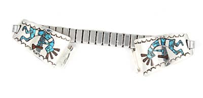 This ladies watch band has sterling silver tips with a kokopelli that is inlaid with chip turquoise and coral stones. Each tip measures approximately 1 1/8″ long including tubing and is about 5/8″ wide at its widest point. Made by Navajo artisan Joleen Yazzie. Placements of color may vary. Some may be all turquoise chip.