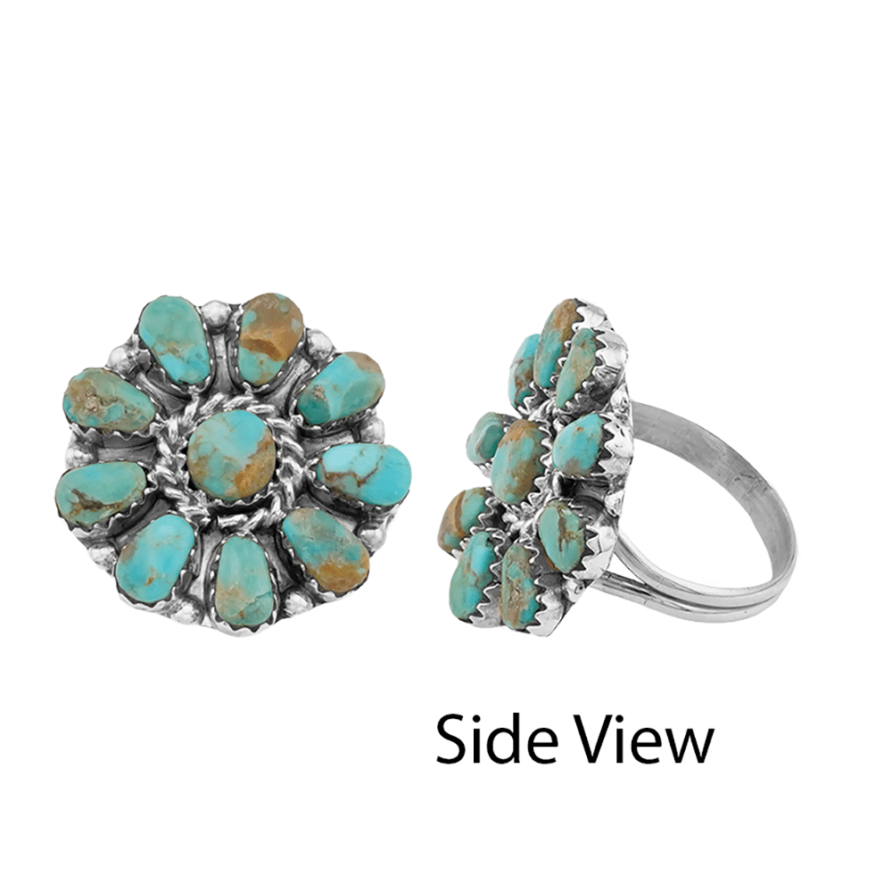 Sterling silver ladies ring with 1 dot and 9 hand cut compressed turquoise stones twist wire and drops on a double wire split shank. Top measures approximately 7/8″ in diameter. It is Navajo hand made by Jason Benally. Amount of blue and green shades on each will vary. Available in size 6 1/2 thru 8 1/2. Choose size when ordering.