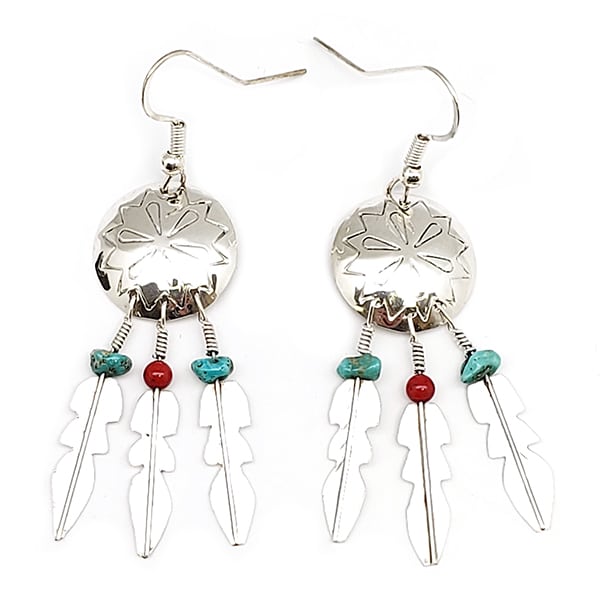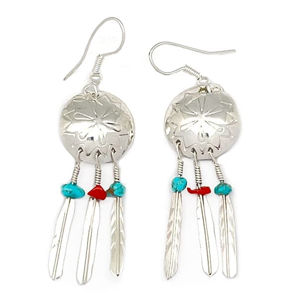 These round stamped sterling silver concho earrings have 3 feathers dangling with two turquoise nuggets and 1 coral nugget or coral bead. They measure approximately 2 3/8″ long including silver plated french wire with concho measuring about 5/8″ in diameter. Handmade by Navajo artisan Emily or Emilia Tsosie. Shape and sizes of nuggets will vary.