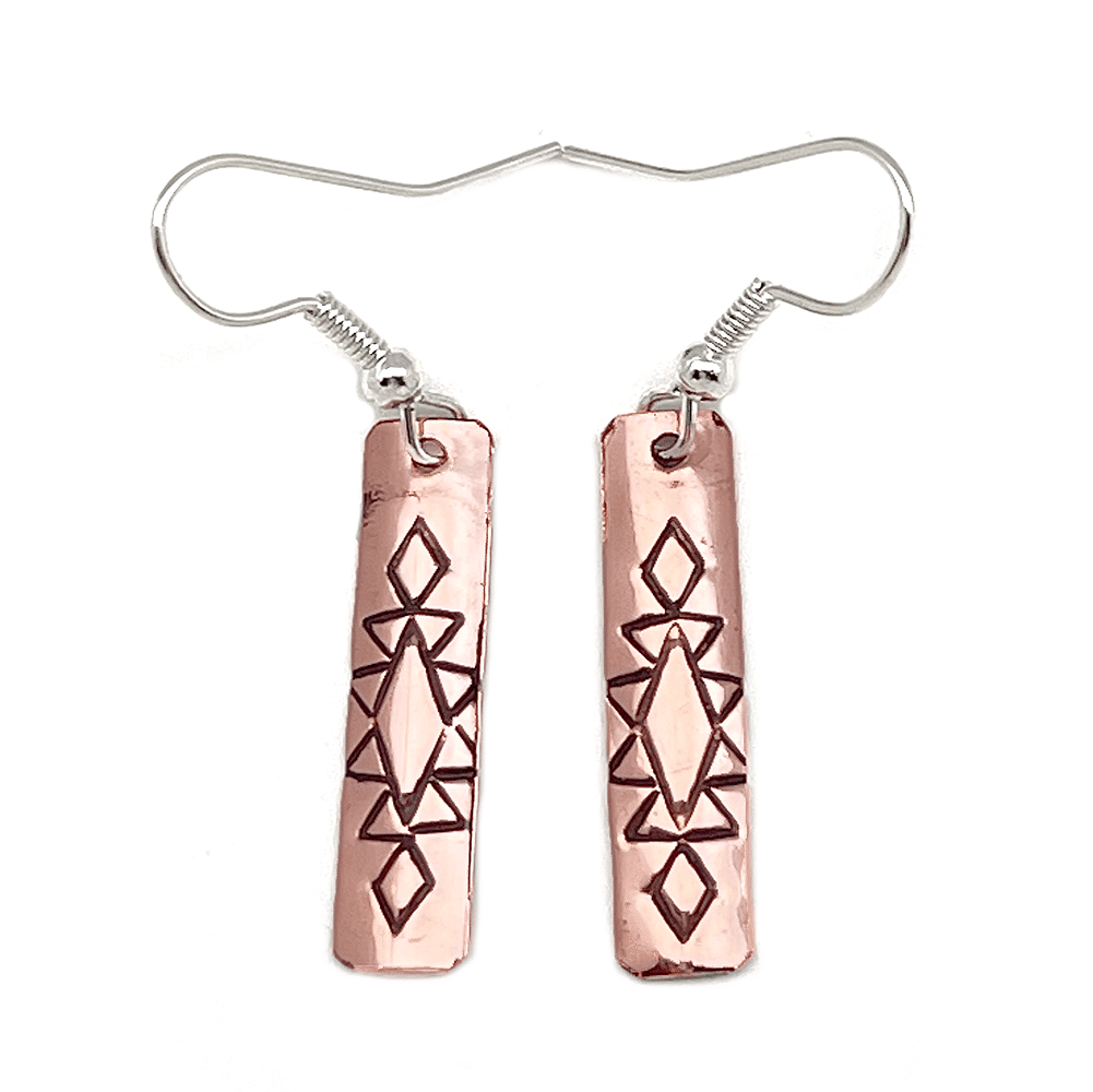 This copper stamped earring measures 1 5/8″ long with silver plated french wire by 1/4″ wide. It is Navajo hand made and crafted by Felicia Etcitty. Stamping designs will vary.