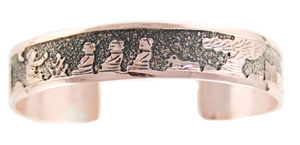 This storyteller copper bracelet is crafted by Navajo artisan Elaine Becenti. It measures approximately 1/2″ wide. Scenes will vary. You may not get the scene that is pictured.