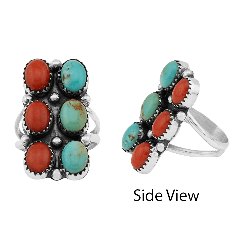 This sterling silver ring features six 6x8mm stabilized turquoise and natural coral stones with silver drops on a double split shank. Top measures approximately 1 1/8″ long by 5/8″ wide. It is Navajo handmade by Rita Dawes. Turquoise shades will vary in blues and greens, with some natural black or brown matrix variations. Available in sizes 6 1/2 through 8 1/2 and 9 1/2. Choose size and color preference when ordering.