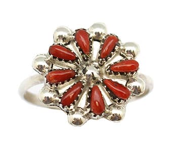Sterling silver, natural coral petti point coral cluster ring on a single wire shank.  Top measures approximately 5/8″ in diameter.  It is Zuni hand made by David Leekity. **Now only available in a size 5.  Color shade of coral may vary from what is pictured.