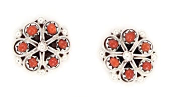 These pinwheel shape sterling silver post earrings measure approximately 9/16” in diameter and have 6 round handcut coral stones. Made by Zuni artisan Gloria Lonasee.