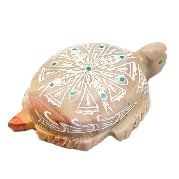The turtle symbolizes longevity and meaningful life. This turtle is carved out of pink dolomite and has etching design, turquoise dot eyes and turquosie dots inliad on its back. It measures 2 1/4″ long, 1 5/8″ wide and just under 1/2″ tall. It is Zuni hand carved and etched by Adrian Cachini. Size will vary slightly and color shades will vary as well.