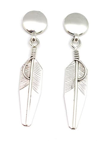 This sterling silver post plain button like earring with a dangle hand made feather. It measures 1 3/4″ long by 3/8″ wide. Native handmade by Navajo artisan Chester Charley.