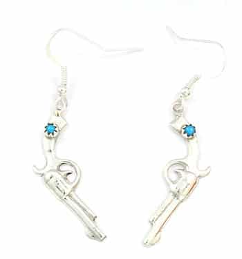 Sand cast sterling silver gun / pistol earrings with a 3mm turquoise stone. They measure approximately 2″ long including silver plated french wire and are just over 3/8″ wide at its widest point. Handcrafted by Navajo artisan Bruce Chee. Turquoise shades will vary in light or teal green. None in dark blue as pictured at this time.