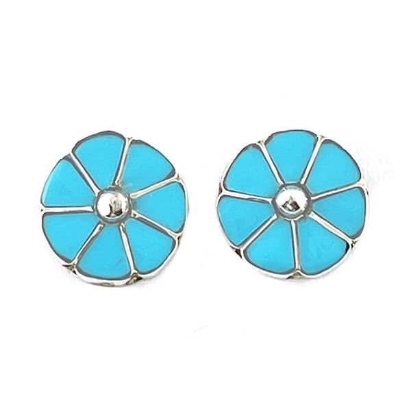 Sterling silver post, flower design earring inlaid with stabilized light blue turquoise and a silver drop in the center. It measures just under 1/2″ in diameter. It is Zuni hand made and inlaid by Walter Lalio.