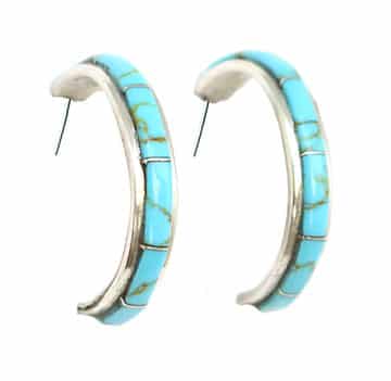 Sterling silver post 1/2 hoop earring inlaid in synthetic turquoise with silver dividers measuring a little over 1/8″ wide and a 7/8″ hoop curve. Native handmade by Navajo artisan Jamie Johnson. Color shade of turquoise will vary.