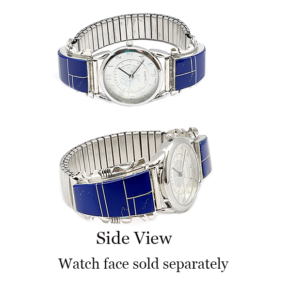 This men’s watch band is inlaid with synthetic lapis stones. Each tip is made out of sterling silver and measures approximately 1 1/2″ long including tubing by 1″ wide at its widest point. Crafted by Navajo artisan Steve Francisco. Pattern of inlay may vary. Watch face sold separately, search stock number Watch1 for faces.