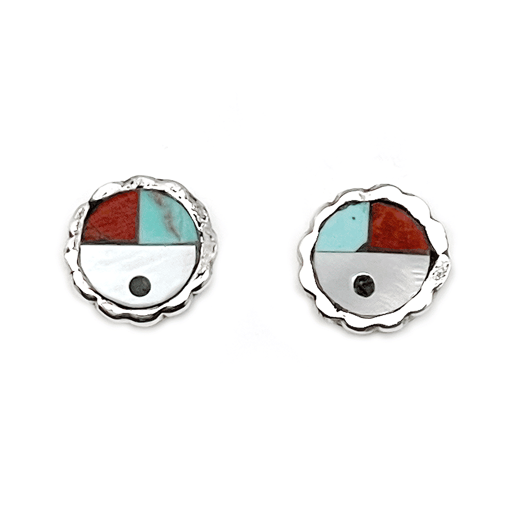 These small sterling silver post sunface earrings are inlaid with turquoise, coral and white mother of pearl and have a scalloped wire border. They measure approximately 3/8″ in diameter and are Zuni handmade by Rebecca Davis. Color shade of turquoise may vary.