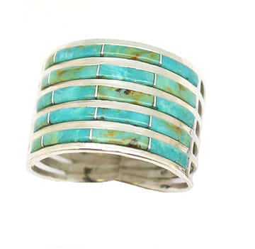 This sterling silver ladies ring is made with 6 square wires for the shank and has 5 rows of inlaid assorted color shade turquoise stones with 4 sections in each row. It measures approximately 5/8″ wide in the center and tapers down. Handmade by Navajo artisan Andrew or Vanna Enrico or Jamie Johnson. Available in blue and green shades together in size 7 1/2 or 8 or mainly in dark blue shades in size 8, 8 1/2, 9 1/2, 10 or 10 1/2. Choose color and size when ordering.