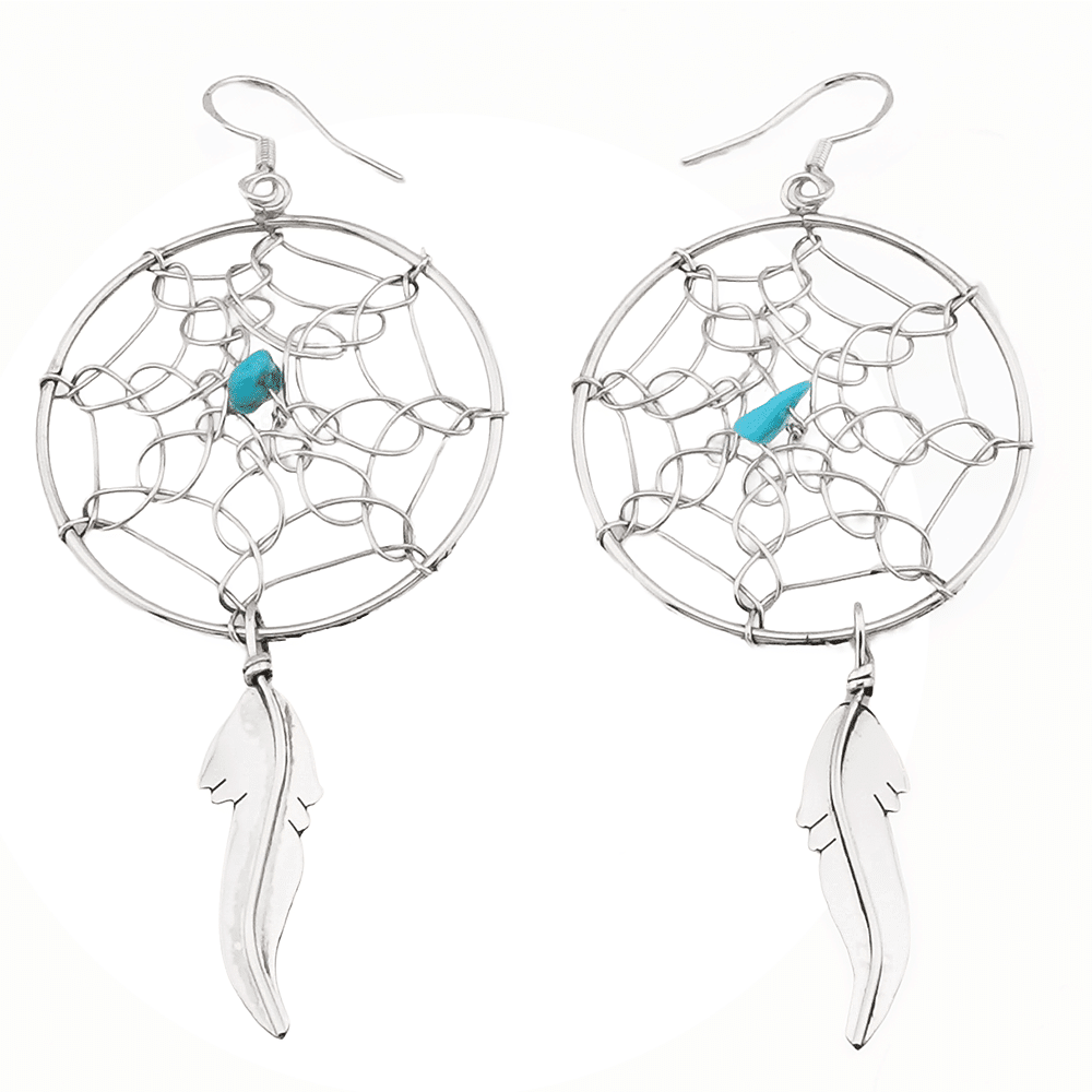 Large sterling silver dream catcher earrings with a small turquoise nugget and hand made feathers. They measure just under 3 1/4″ long including silver plated French wire by 1 1/4″ wide in diameter. They are Navajo hand made by Lorenzo Arviso. Size, shape and color shade of turquoise nuggets will vary.