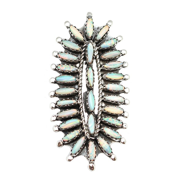 Sterling silver long cluster of synthetic white opal needlepoint stones on a single wire split shank. Top measures 1 7/8″ long by just under 1″ wide. It is Navajo hand made by Nathaniel Rosemary Tom Nez. ***Only available in size 6.***