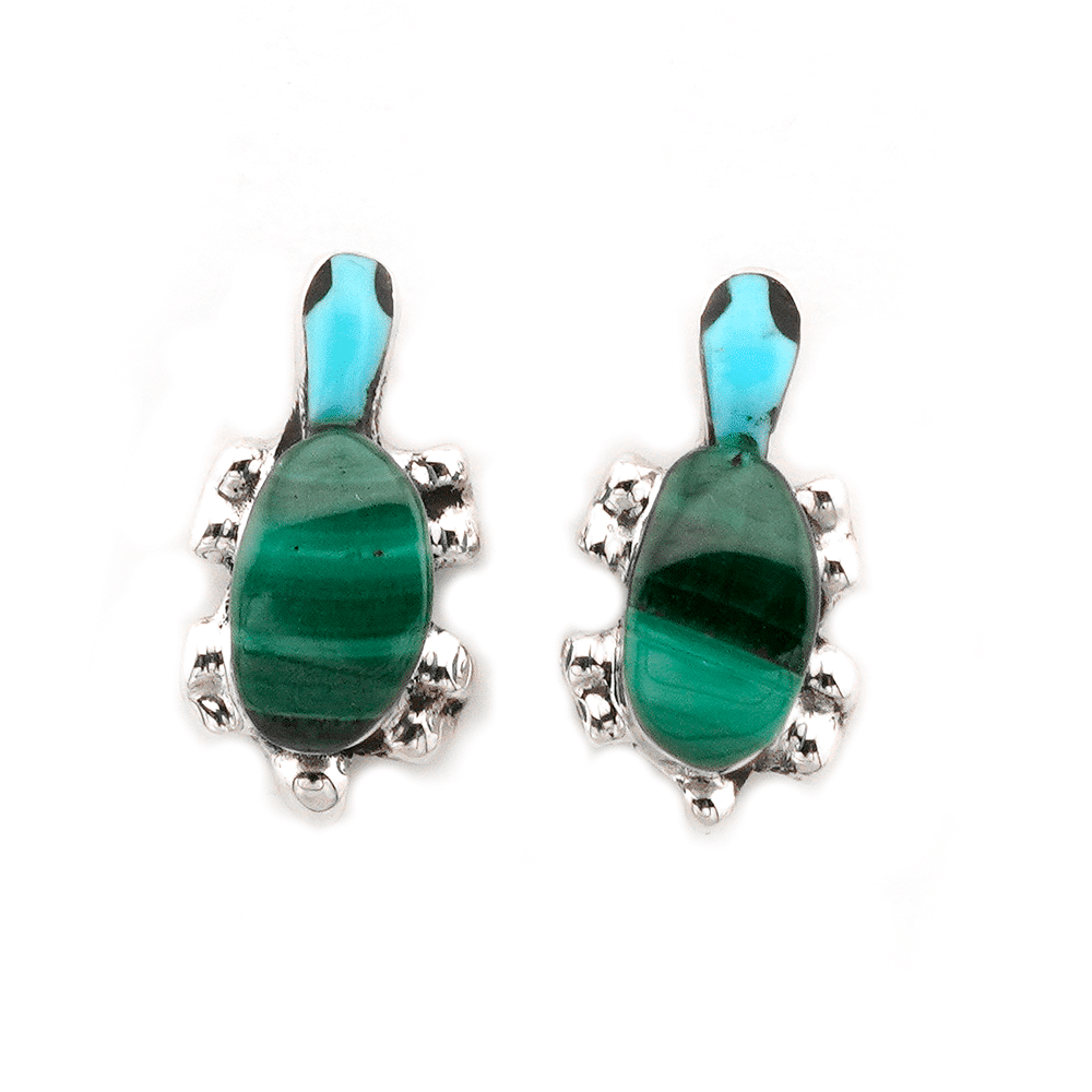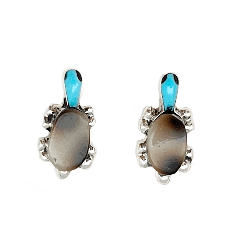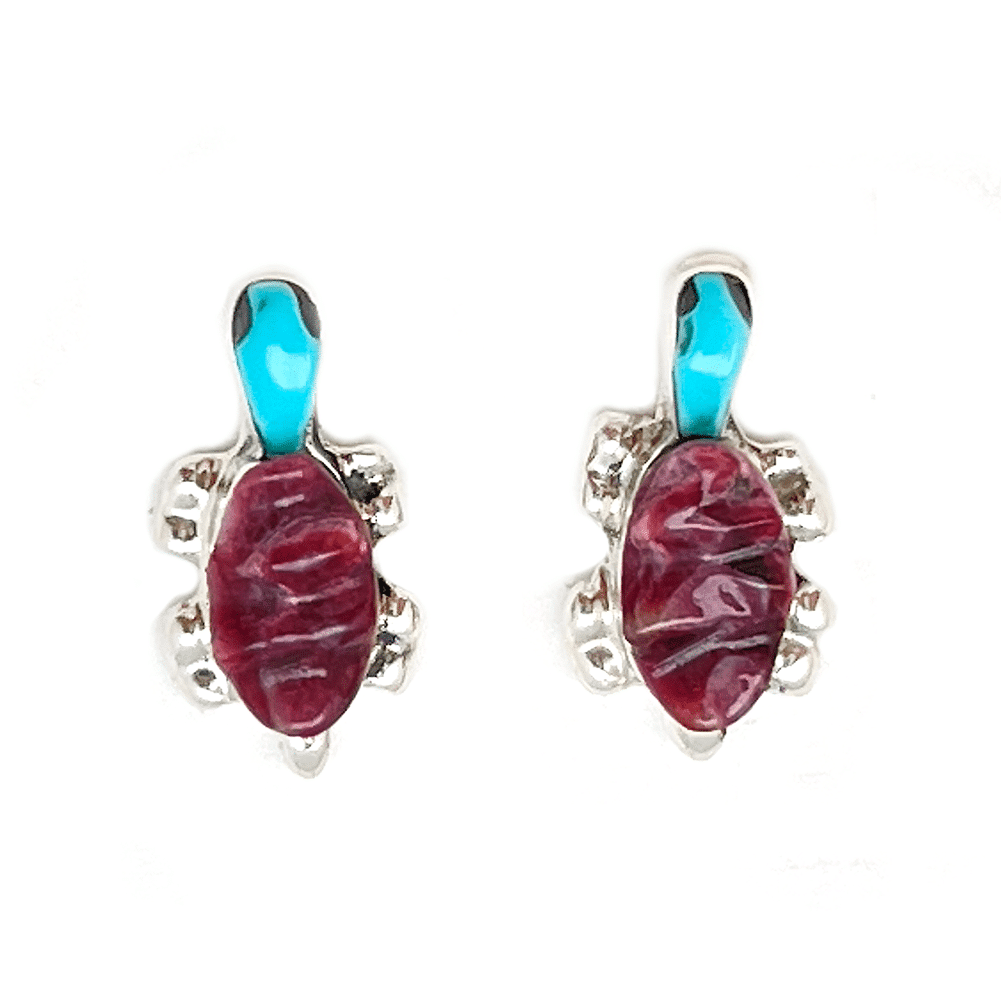 Sterling silver inlay turtle stud earrings with a carved red spiny oyster shell back and turquoise head. Earring measure approximately 1/2″ long by 1/4″ wide at widest point. It is Zuni handmade and inlaid by Lenette Chuyate. Also available in smooth malachite back, carved orange spiny oyster, carved purple spiny oyster, carved mother of pearl back or smooth cowry shell back all with turquoise head. Choose color and style when ordering.