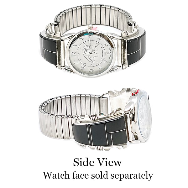 Sterling silver men’s watch tips, inlaid with black jet with silver dividers and a side cut border. Each tip measures approximately 1 1/2″ long including tubing by just over 1″ wide at widest point. Handmade by Navajo artisan Steve Francisco. Patterns of inlay will vary. Watch face sold separately, search stock number Watch1 for faces.