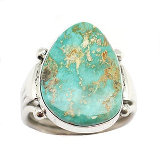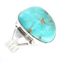 Navajo made sterling silver mens ring with large freeform assorted type of turquoise with a 4-wire shank. Top measures approximately 3/4″ to 7/8″ long by 5/8″ to 3/4″ wide. It is Navajo hand made by Marcus Gishal. Available in blue or green shades. Some with heavy tan to brown matrix. Shapes will vary. Choose color preference and size when ordering.