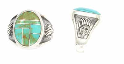 Sterling silver, good weight, cast mens ring inlaid with turquoise on top and has paws on each side of the shank. Measures approximately 13/16″ long by 5/8″ wide at the top. Inlaid by a Navajo artisan. Inlay patterns will vary as well as color shade. Availablae in blue and green shades in size 9 or 10 1/2. Choose color and size when ordering.