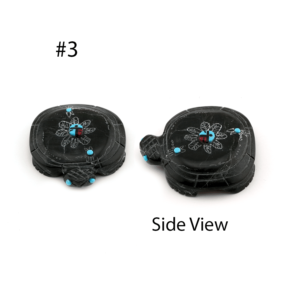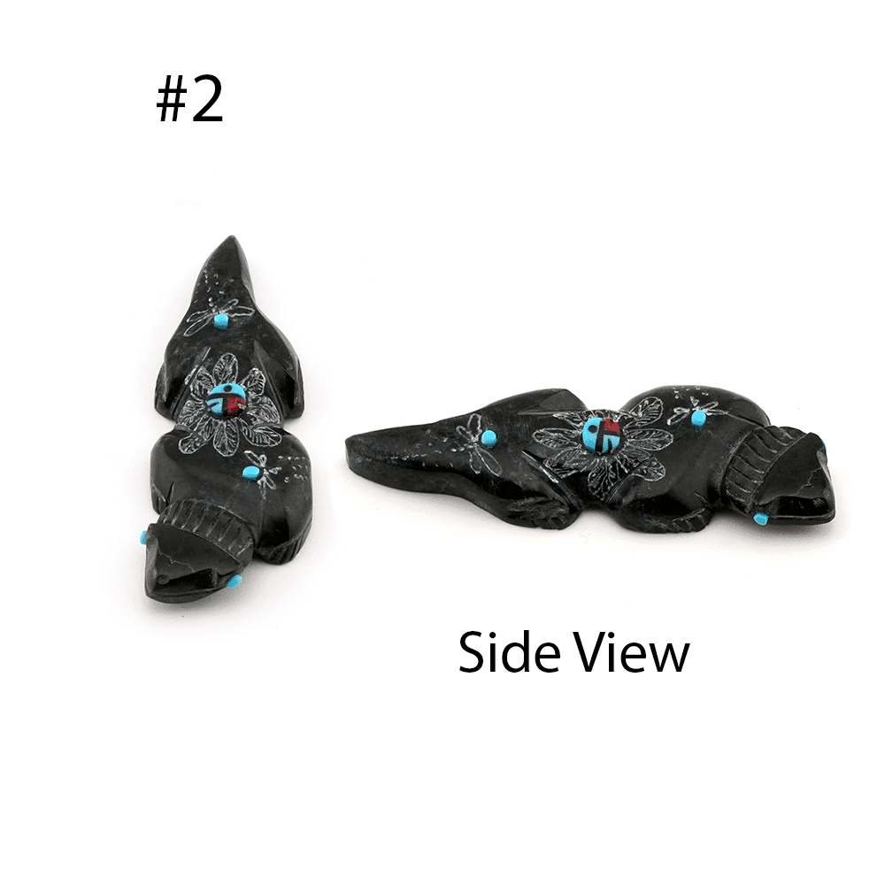 These assorted animals are carved from black rock that has etched designs with turquoise dots, and sunface inlaid with turquoise dot eyes. They are Zuni hand carved by Danette Laate.