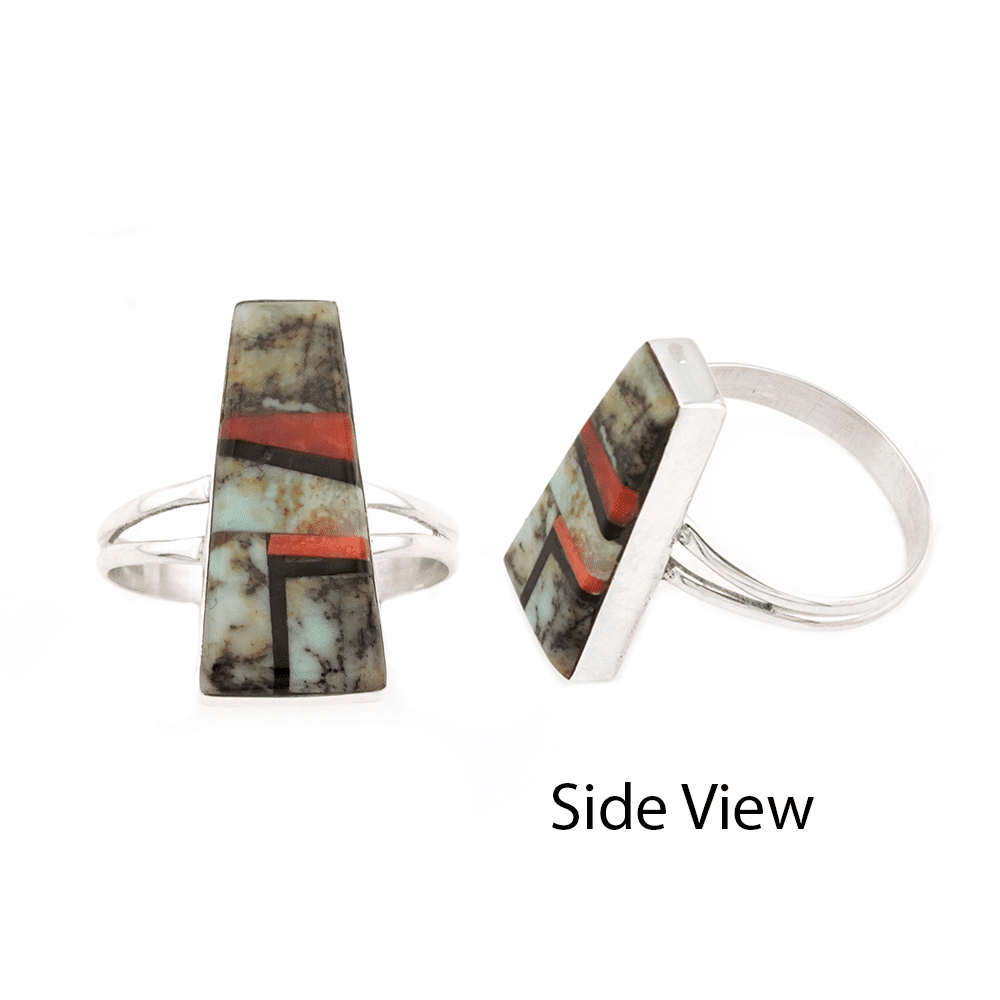 Sterling silver ring inlaid in multi color inlay of turquoise, coral, spiny oyster and jet in a tapered rectangle shape on a double wire shank. Top measures just over 7/8″ long by just over 1/4″ wide on one end and just over 3/8″ wide on the other end. It is Navajo hand made and inlaid by Priscilla Smith. Now only this one available in size 10 1/2.