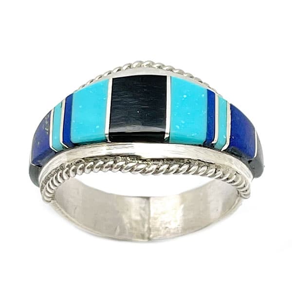 Sterling silver ring, inlaid with jet, turquoise and lapis stones and has a twist wire border. It measures approximately 1/2″ wide in the center and tapers down to a plain wire shank. Inlay is on top half of ring. It is Zuni handmade and inlaid by Deirdre Panteah Luna. ****Now only available in all black jet and silver dividers in size 12. ****None available in color as pictured at this time.****