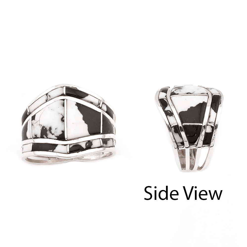 Sterling silver 4 square wire ring and shank inlaid with stabilized white buffalo stones in 3 rows with center row being diamond shape and top and bottom in V shape. Top measures just over 5/8″ wide and tapers down. It is Navajo hand made and inlaid by Andrew and or Vanna Enrico. ***Now only available in size 7 1/2. Amount of black and white on each ring will vary.