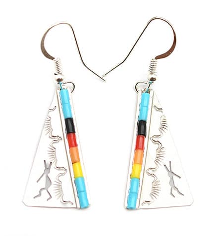 This sterling silver earring has a cut out of a kokopelli and stamping on one side and a strip of multi colored heishi down the other side. It is Navajo hand crafted by Linda James. Colors of heishi will vary and stamping may vary as well. All heishi is synthetic. Available in all turquoise, all malachite and all yellow. Choose colors when ordering. None available in multi-color like pictured.