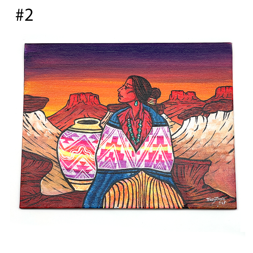 Canvas paintings of a Native American lady with her pottery and different outdoor scenery. They measures 8″ long by 10″ wide. They are Navajo hand painted by Terry Tsosie. Only one of each available. Choose by number when ordering.