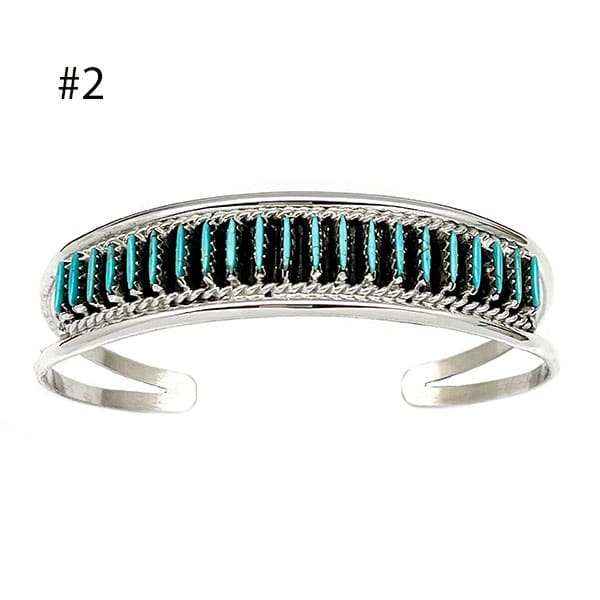 This sterling silver bracelet has 21 Kingman turquoise needlepoint stones that are straight across with plain double shank (#2). Wrist size measures 5 3/4″ with 1 1/8″ opening. Center measures 3/4″ wide. Navajo handmade by Roland Francisco.