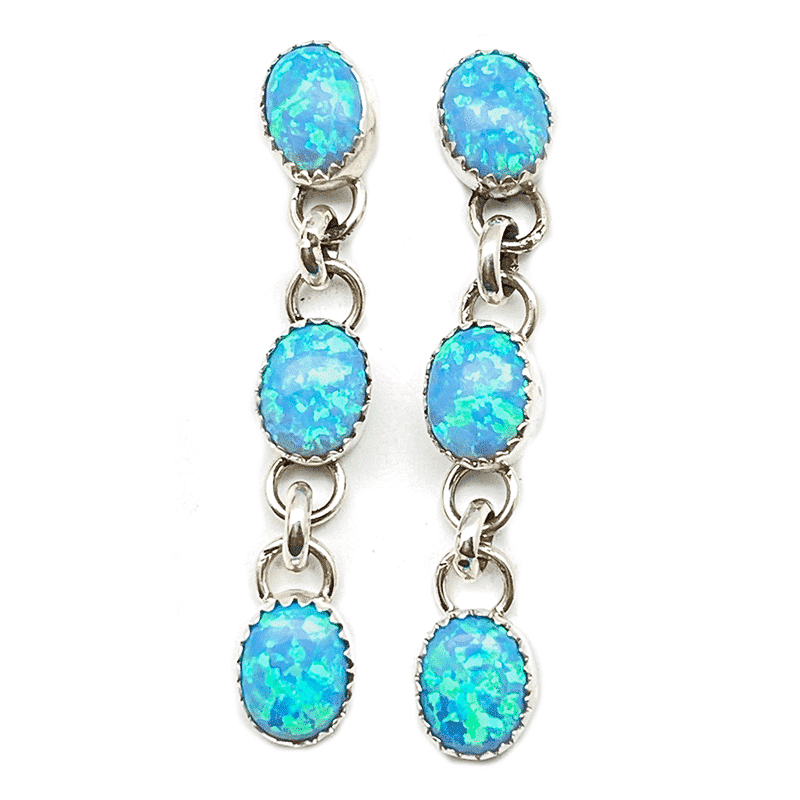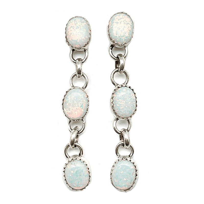 Sterling silver post earring with 3- 7x9mm oval white synthetic opal stones set in saw tooth bezel. It measures almost 2″ long by 5/16″ wide. It is Navajo hand made by Jeanette Yazzie. Also available in light blue synthetic opal. Choose color when ordering.