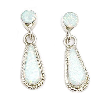 These sterling silver earrings are inlaid with synthetic white opal with a plain round dot post and a tear drop dangle with twist wire border. It measures approximately 1″ long by just under 3/8″ wide at widest. Also available with a round synthetic green opal dot on the post with a white opal teardrop dangle or a light blue opal on the post with a white opal teardrop dangle (not pictured). Navajo handmade by artisan Victor Thompson.  Choose color when ordering.