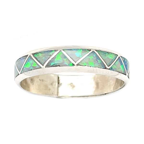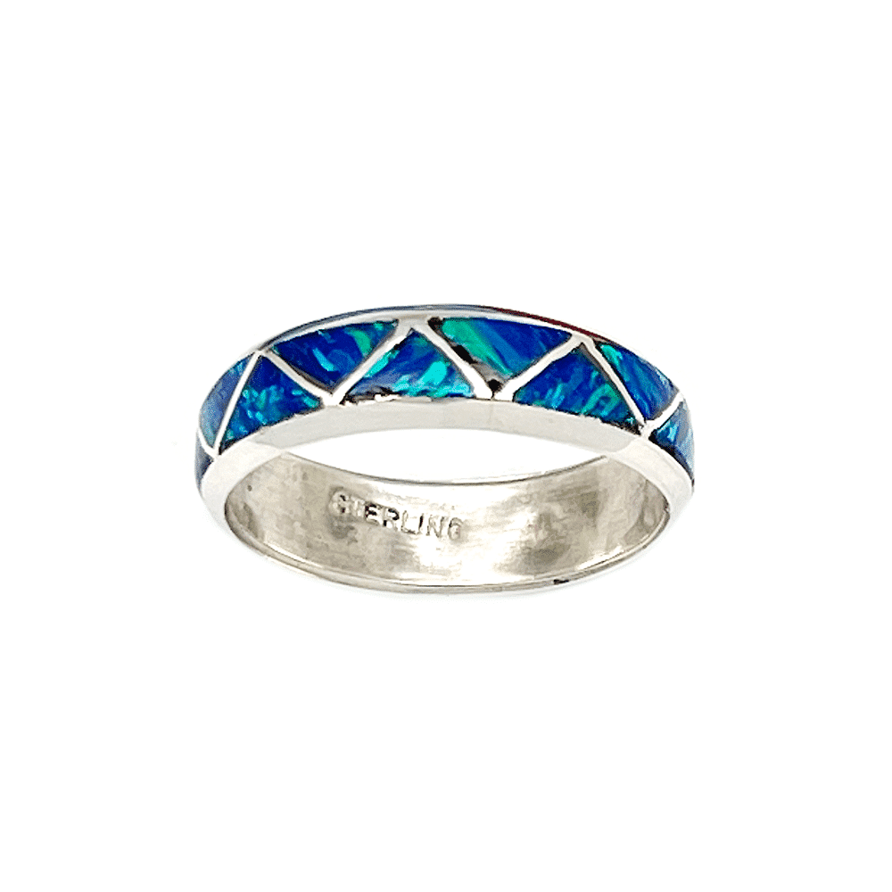 Sterling silver band inlaid all the way around in a zig zag pattern in dark blue synthetic opal. It measures 3/16″ wide. Navajo hand made and inlaid by Roy Thompson. Available in size 8, 10 1/2 or 13. Also available in black opal with red fire in size 10 or 13 or white opal in size 8 or 13. Choose color and size when ordering. All opals are synthetic.