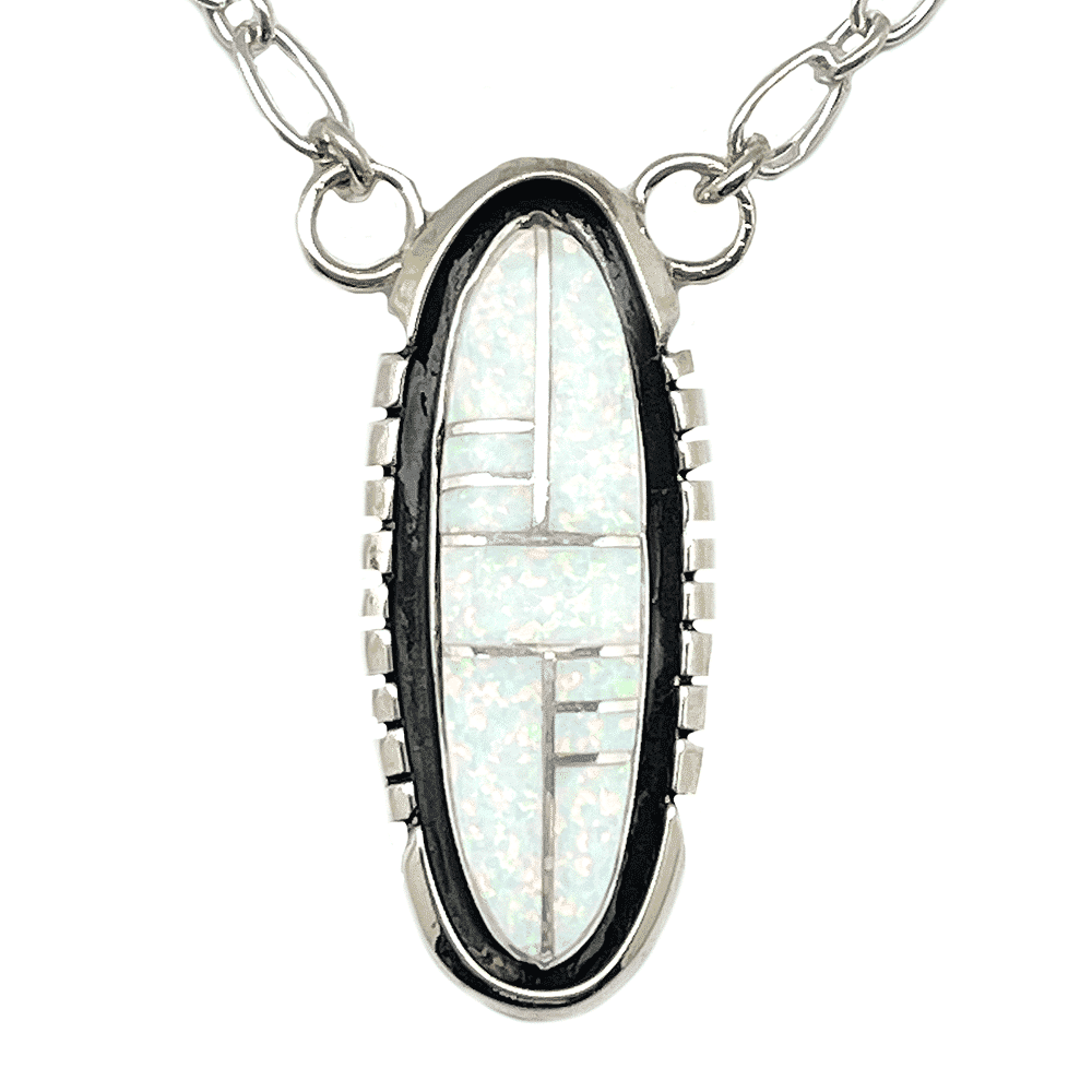 This sterling silver oval necklace is inlaid with purple synthetic opal, silver dividers, oxidized background with a triangle border and cuts. Pendant measures approximately 1 3/8″ long by 5/8″ wide. Sterling silver chain, clasp and findings measure approximately 22′ long. Pendant is Navajo hand made and inlaid by Edward Johnson. Also available in white synthetic opal. Choose color when ordering. Inlay patterns may vary.