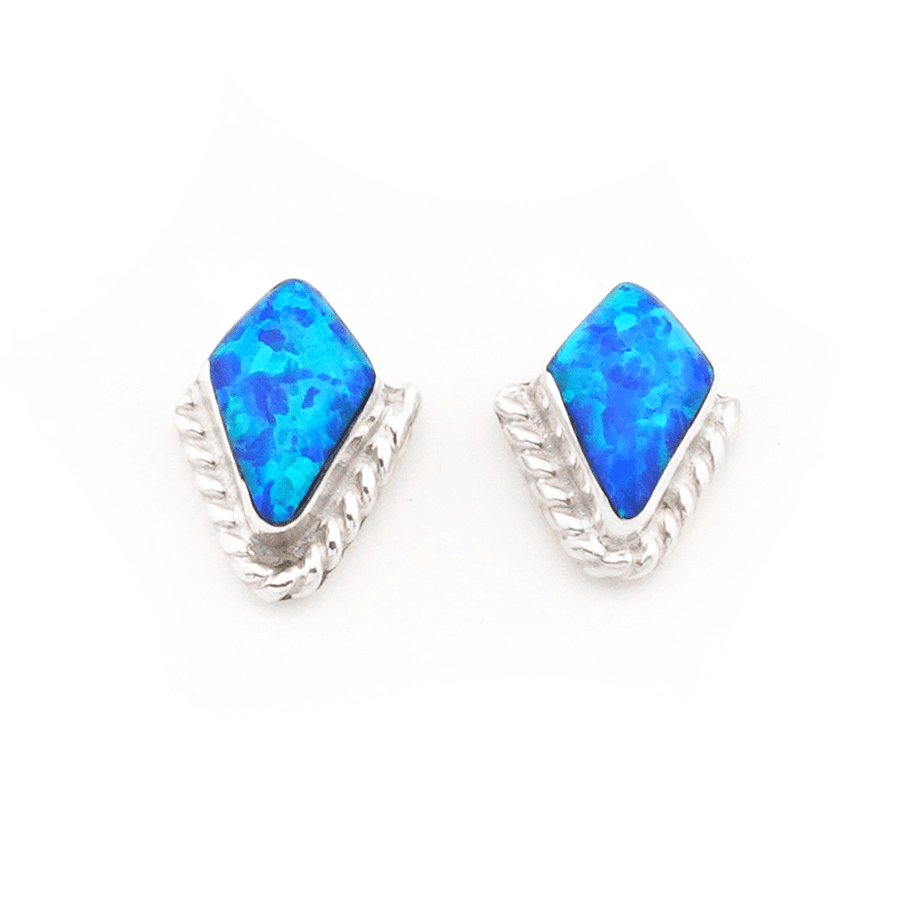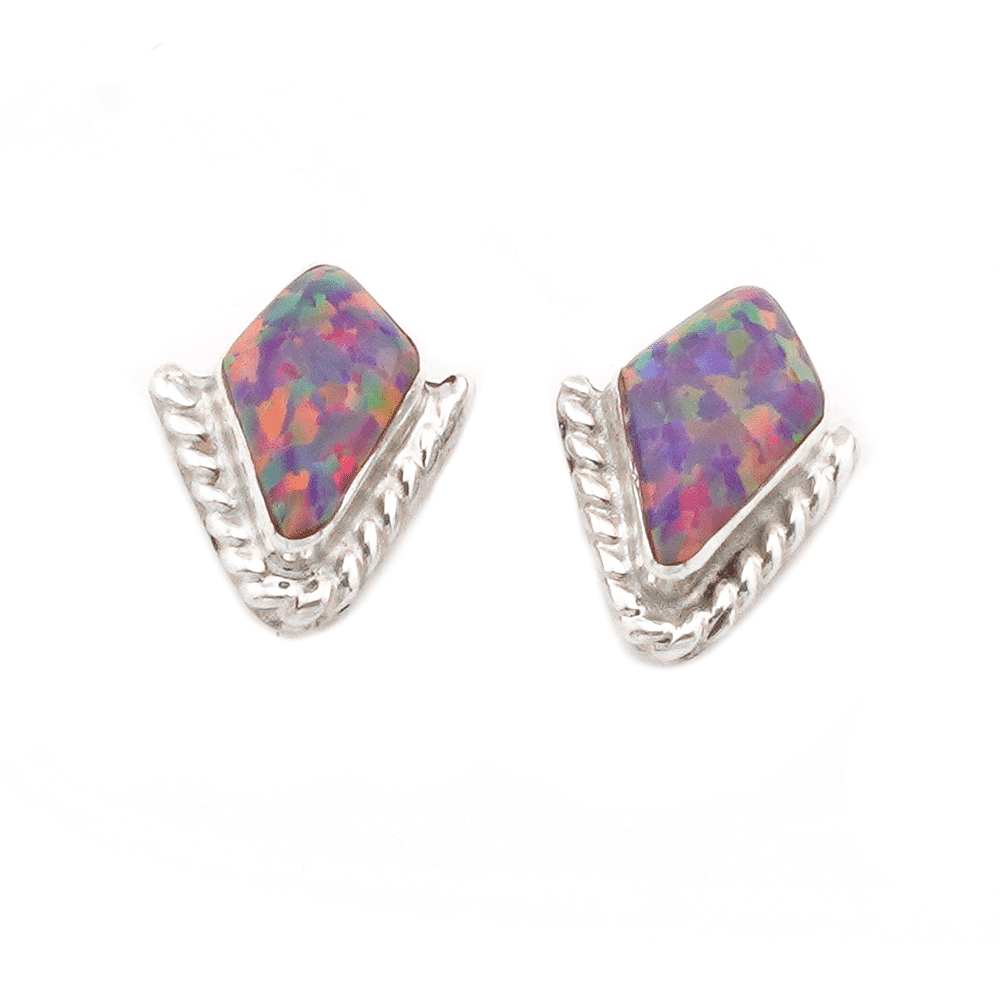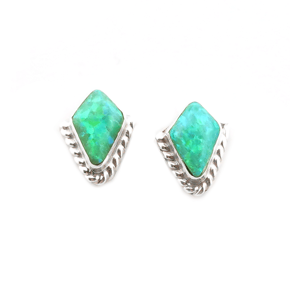 These sterling silver diamond shape stud earrings have a synthetic light green opal stone with a twist wire border around only 1/2 of the earring. It measures approximately 5/16″ in length by 5/16″ wide at its widest point. Made by Zuni artisan Donovan Mahkee. Also available in dark blue, dark red or pink sea breeze synthetic opal. Choose color when ordering.