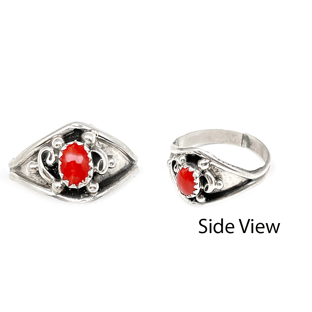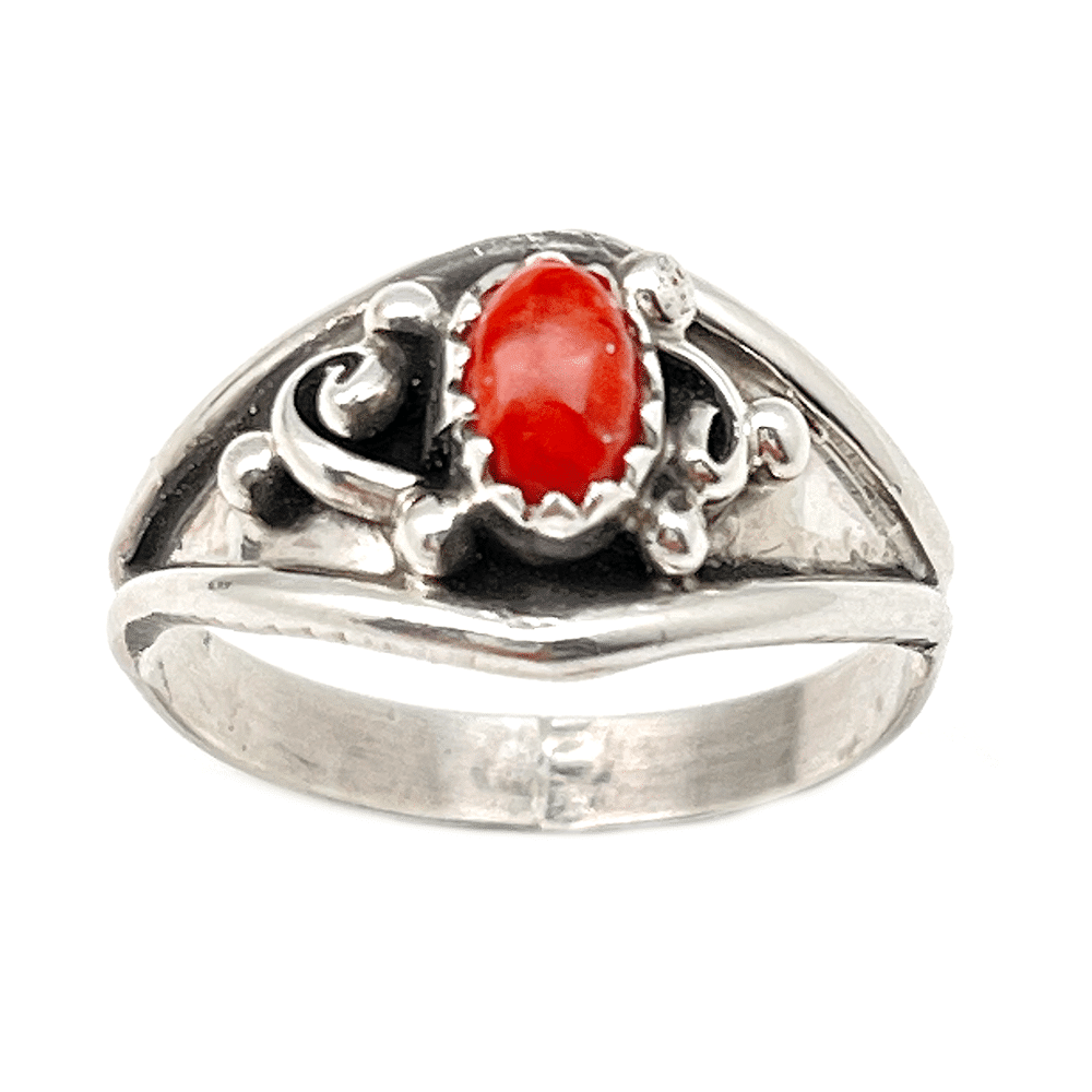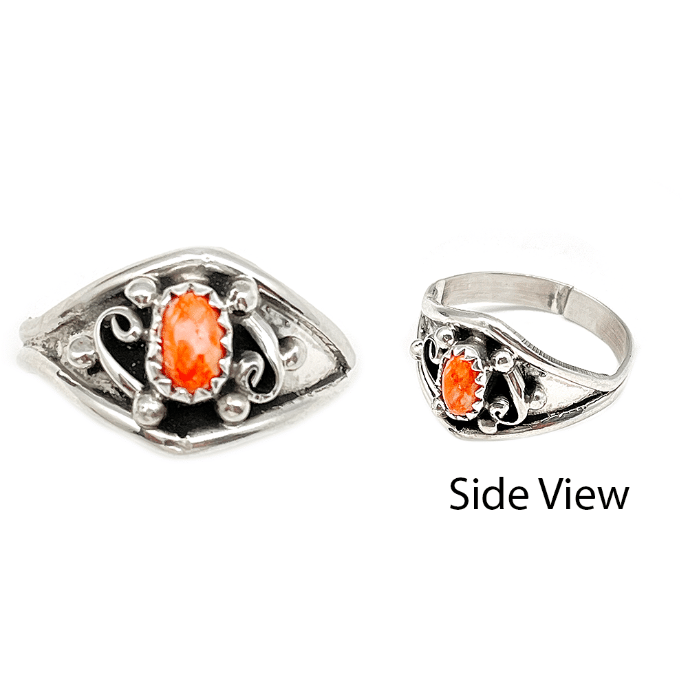 Sterling silver ladies ring with a 4x6mm orange spiny oyster stone, a curly Q on each side and drops. Top measures 1/2″ long and tapers down to 1/8″ wide. It is Navajo hand made by Annette Chiquito. Available in sizes 6, 7 or 7 1/2. Also available in: Coral – size 7 1/2 Red spiny oyster in size 7 1/2 or 8 Choose color and size when ordering.